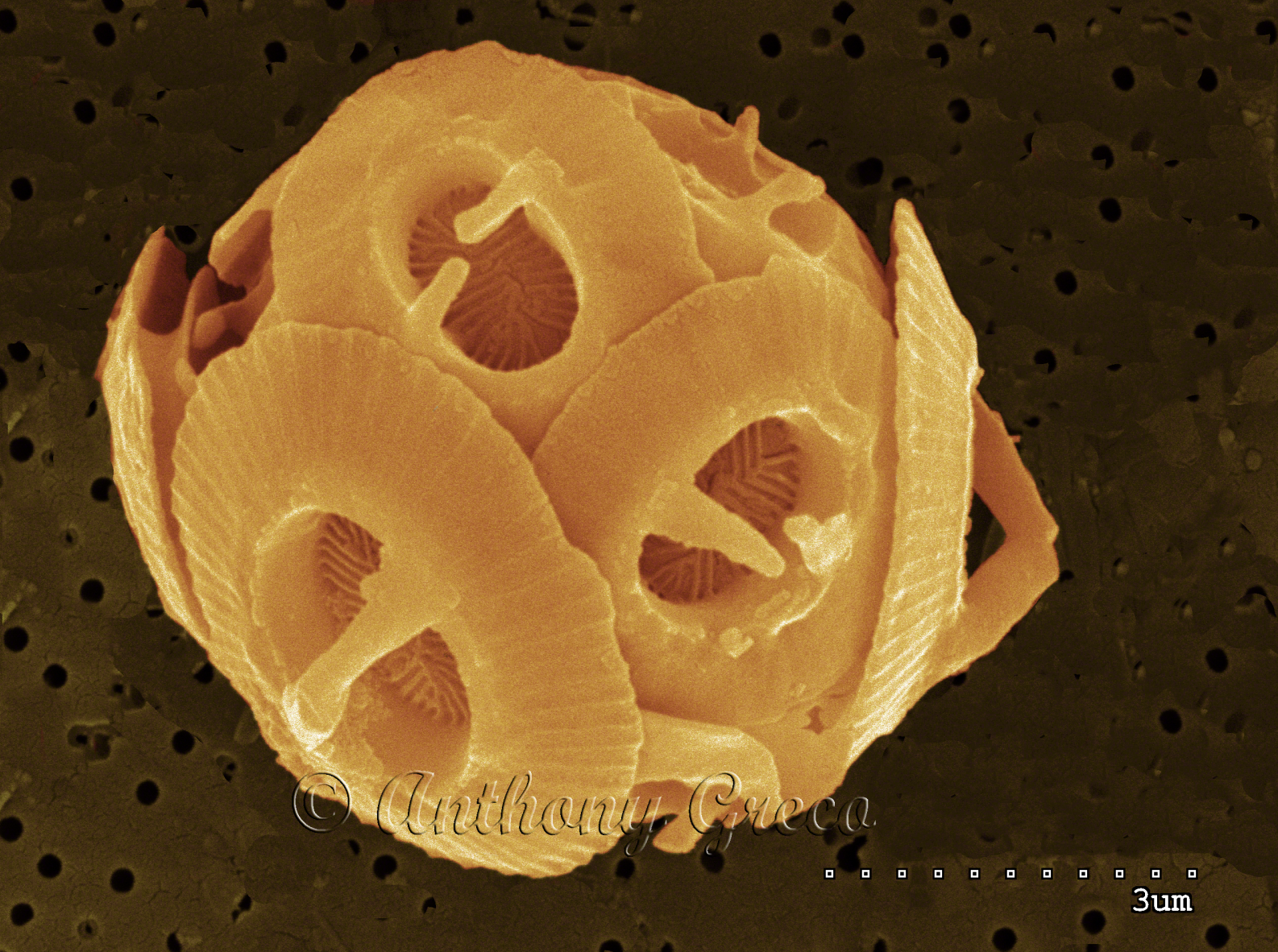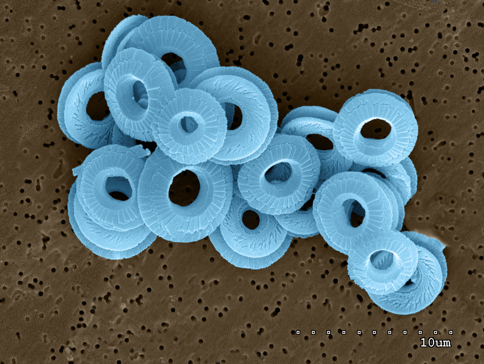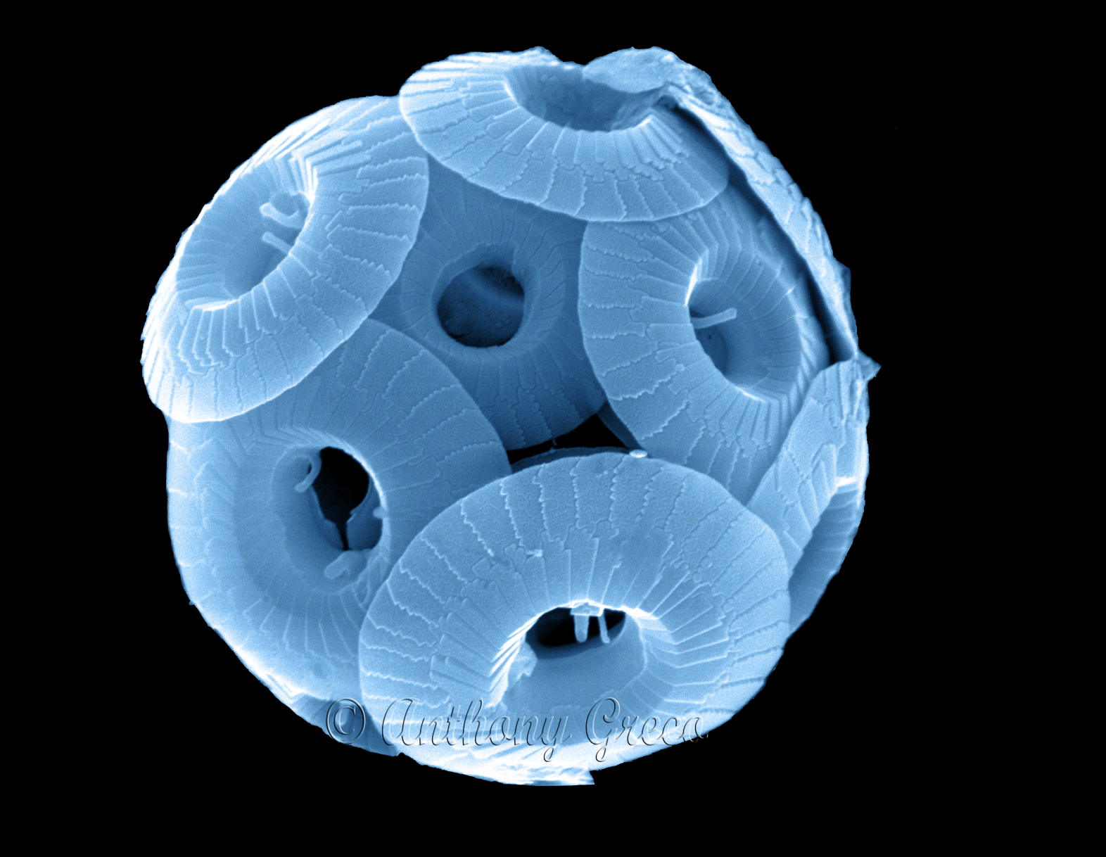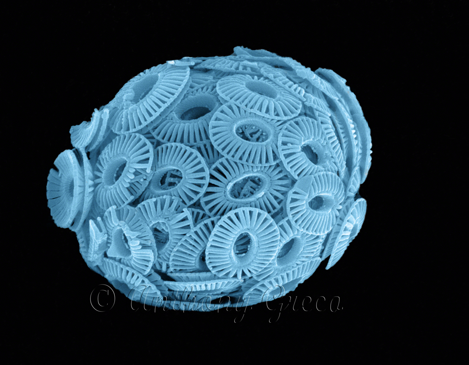 Tiny minute golden brown algae 15-100 um in diameter make up this group. During one stage they secrete platelets of calcite called coccoliths; these coccoliths interlock to form an external skeleton called the coccosphere which surrounds the living cell. They are extremely abundant in the marine sediments and are routinely used in studies of paleoclimatology (the study of ancient oceans) and biostratigraphy (the study of the temporal and spatial distribution of fossil organisms in sediments). The White Cliffs of Dover and blackboard chalk are composed of coccoliths.