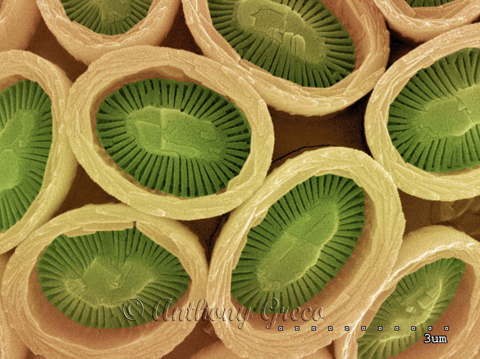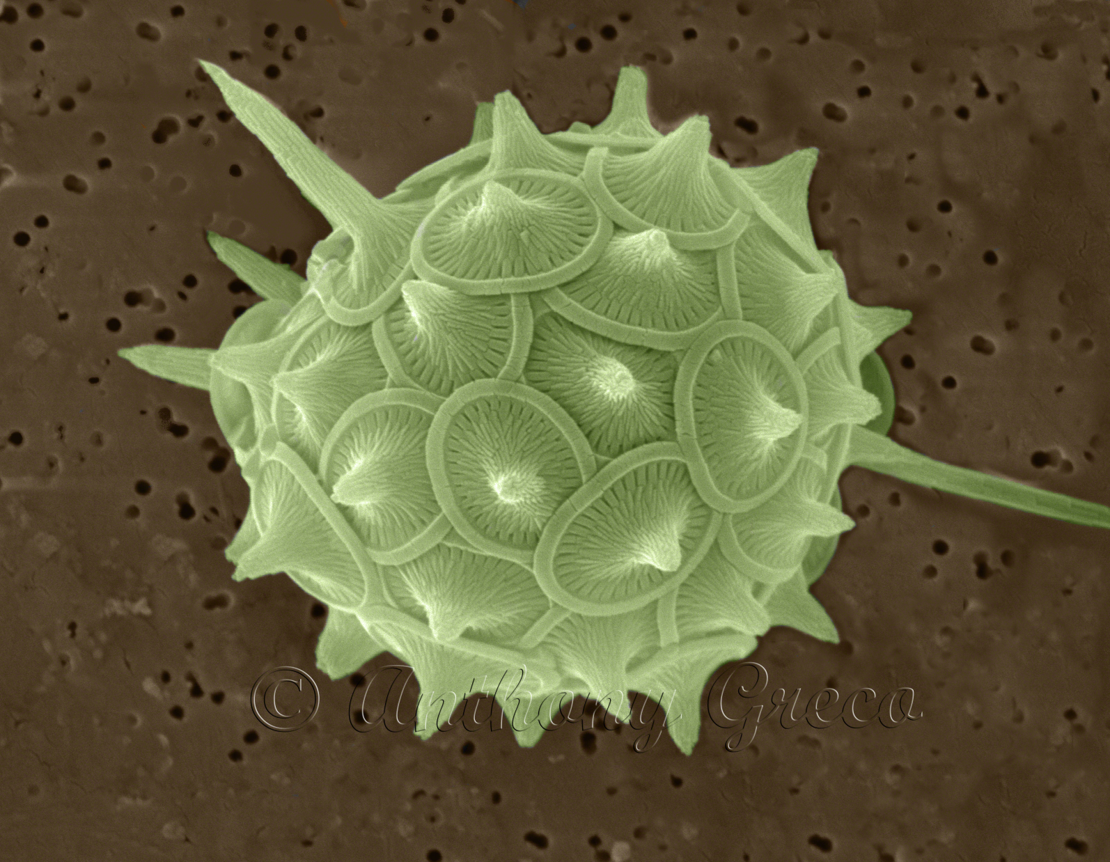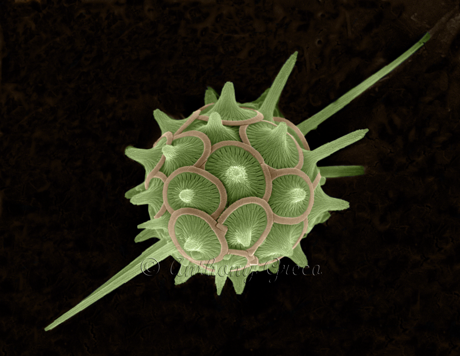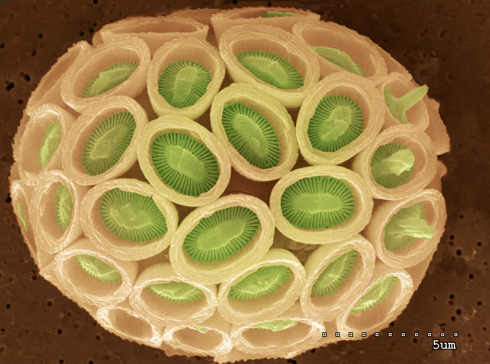 Tiny minute golden brown algae 15-100 um in diameter make up this group. During one stage they secrete platelets of calcite called coccoliths; these coccoliths interlock to form an external skeleton called the coccosphere which surrounds the living cell. They are extremely abundant in the marine sediments and are routinely used in studies of paleoclimatology (the study of ancient oceans) and biostratigraphy (the study of the temporal and spatial distribution of fossil organisms in sediments). The White Cliffs of Dover and blackboard chalk are composed of coccoliths.