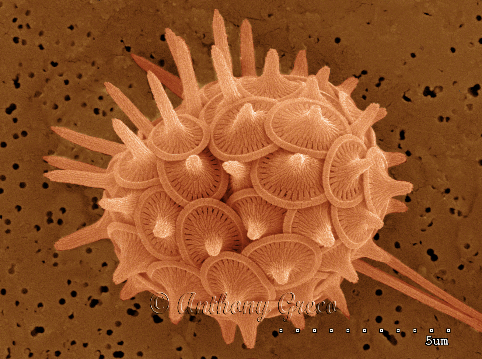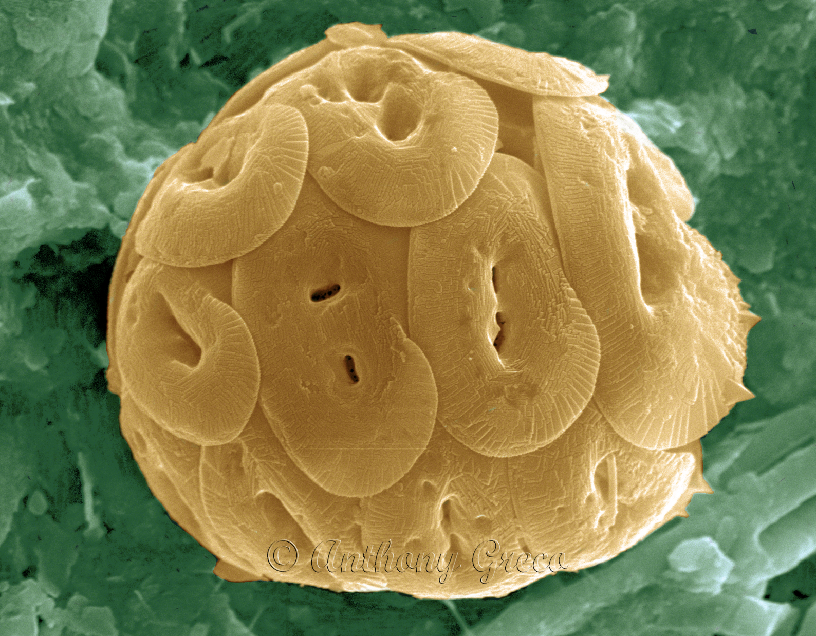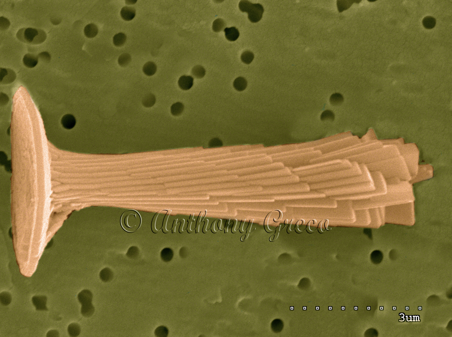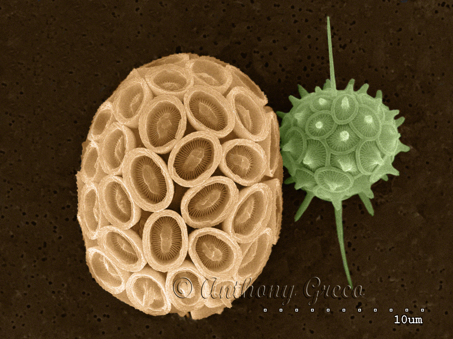 Tiny minute golden brown algae 15-100 um in diameter make up this group. During one stage they secrete platelets of calcite called coccoliths; these coccoliths interlock to form an external skeleton called the coccosphere which surrounds the living cell. They are extremely abundant in the marine sediments and are routinely used in studies of paleoclimatology (the study of ancient oceans) and biostratigraphy (the study of the temporal and spatial distribution of fossil organisms in sediments). The White Cliffs of Dover and blackboard chalk are composed of coccoliths.